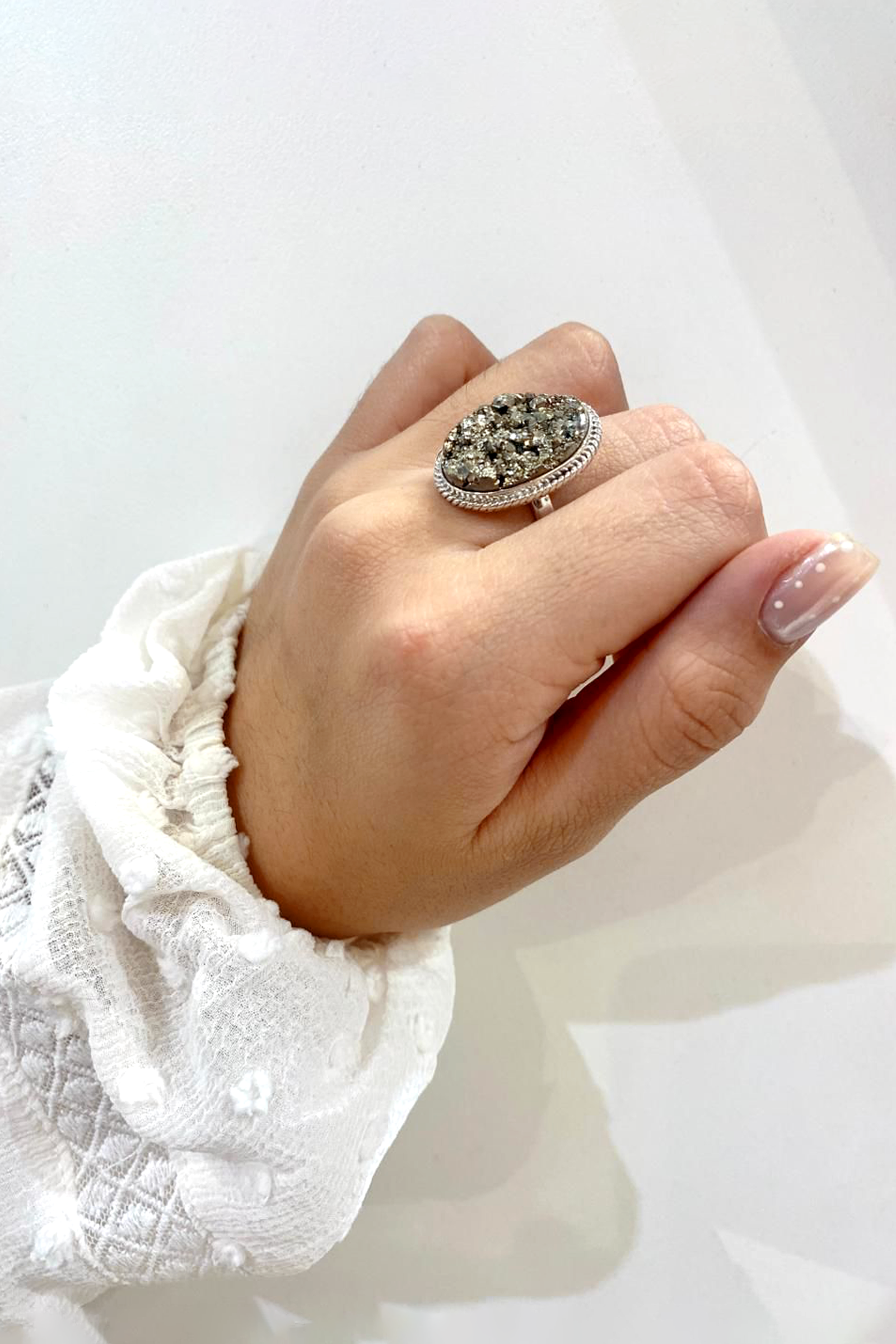 La pirita, conocida como la piedra de la abundancia, es un poderoso símbolo de prosperidad y protección. Llevar un anillo con esta gema ayuda a atraer oportunidades y estabilidad económica, al mismo tiempo que actúa como un escudo frente a las energías negativas. Su energía vital impulsa la confianza, la claridad mental y la determinación para alcanzar metas. Además, promueve la acción y la motivación, llenando de dinamismo y fortaleza cada paso del camino.