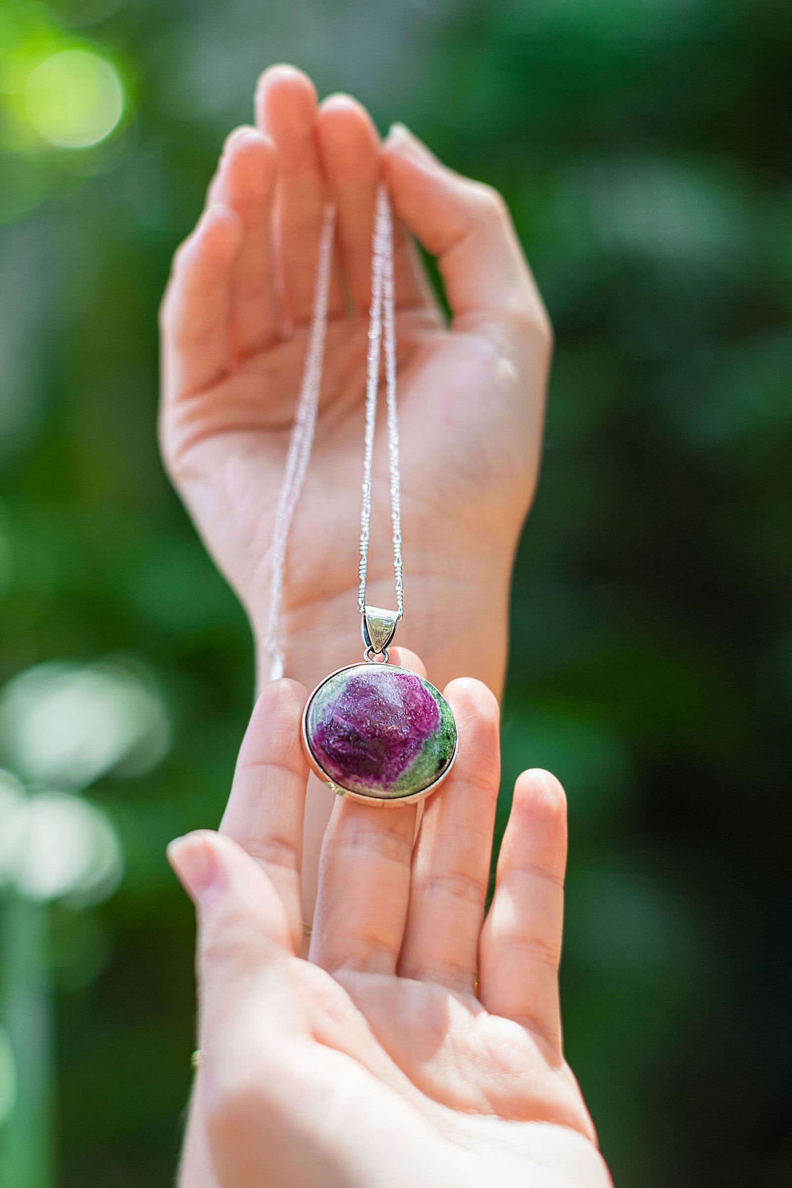 Una piedra poco vista y autentica. La rubizoisita, en contraste vibrante de verdes y rosas, se fusiona con la plata 950 para crear un collar único y lleno de energía autentica.